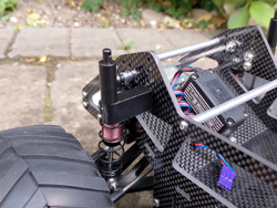 A carbon replacement for the stock wheelie bar, this fits around the gearbox much tighter than the original and has a wider delrin wheel that runs on dual ball bearings.